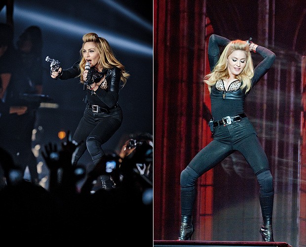 Madonna segurou armas durante as músicas Revolver e Gang Bang.LEIA MAIS: Madonna mostra o bumbum em show na Itália
